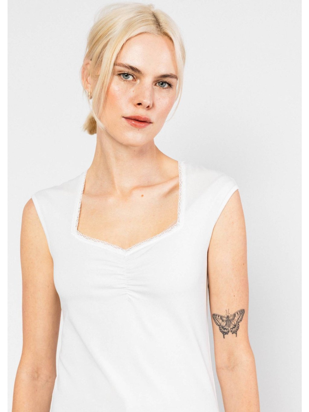 Jednobarevné dámské tílko od značky Blutsgeschwister. Toto tílko působí svěže a nadčasově, takže se snadno stane univerzálním základem letního šatníku. Díky lehkému materiálu a ženskému střihu jej využijete jak samostatně, tak jako jemnou vrstvu pod sako či kardigan.