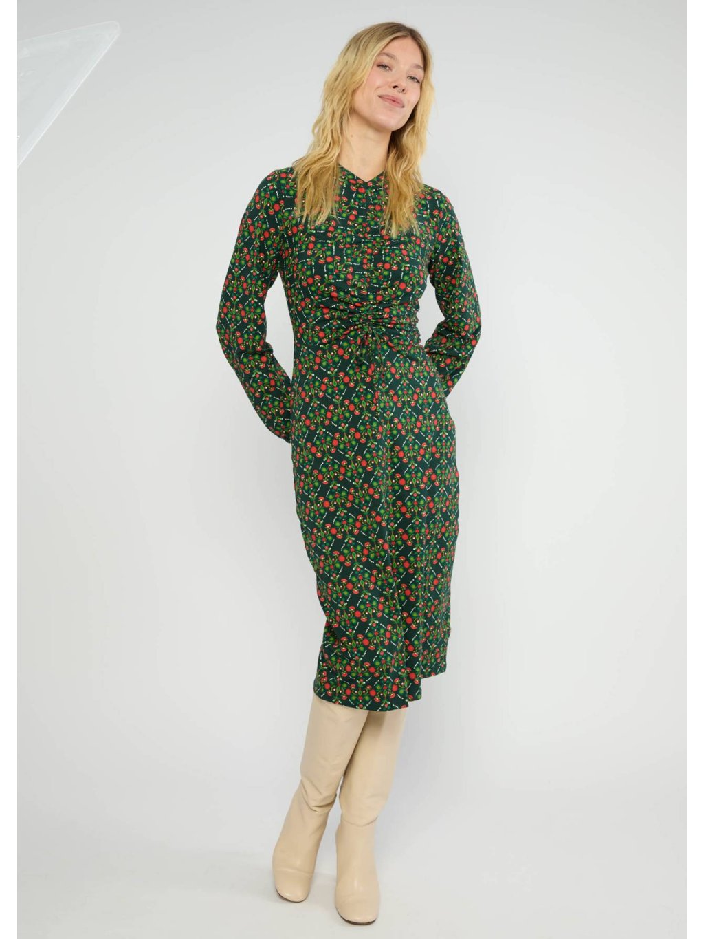 • dekorativní řasení v oblasti dekoltu - stažení šňůrkou v pase
